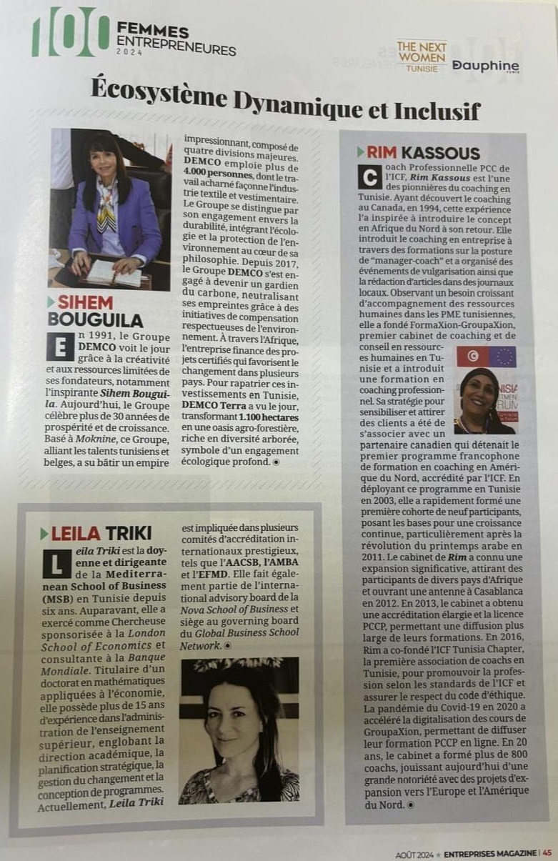 GroupaXion est fier d’annoncer que Mme Rim Kassous, CEO de GroupaXion, figure pour la 2ᵉ fois parmi les 100 femmes les plus influentes en Tunisie, selon le magazine Entreprises dans son dernier numéro 🌟